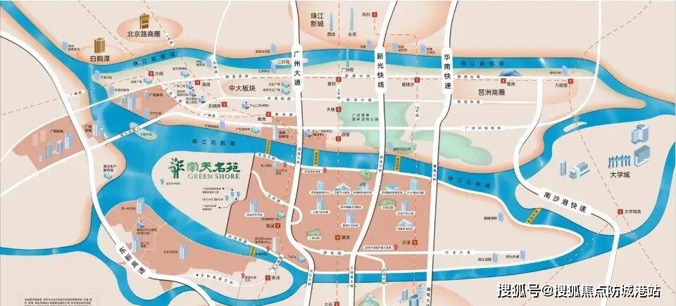 项目距洛溪大桥与新光快速路入口车程均在数分钟范围内,这是南天名苑连接广州主城区的核心交通脉络。洛溪岛作为继二沙岛之后,广州市中心第二个被纳入主城区核心地段的中轴岛屿,其地理位置的特殊性不言而喻。根据2018年国规委发布的主城区范围,洛溪岛正式纳入核心版图,广州城市中轴线南移至此,形成了与广州塔、珠江新城遥相呼应的城市景观带。南天名苑恰好占据洛溪岛的岛尖位置,处于城市中轴与珠江后航道的交汇点,这种“双轴交汇”的区位属性,奠定了其在广州豪宅版图中的独特地位。