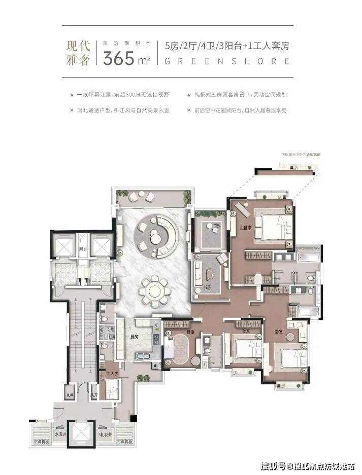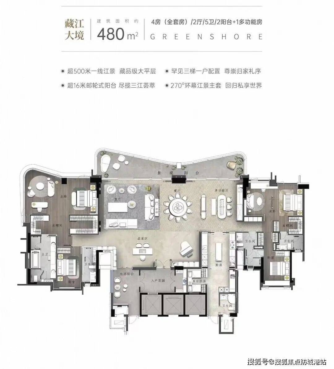 在空间功能划分上,叠墅产品展现了极强的灵活性。例如,两叠产品可做7房,三叠产品可做6房,满足了多代同堂或需要独立功能空间(如书房、影音室、健身房)的家庭需求。约6.8米挑空的餐客厅设计,极大地提升了空间的垂直感与气势;中西双厨的配置,则兼顾了中式烹饪的油烟隔离与西式社交的开放需求。此外,动静分区、南北对流、U型阳台360°观景以及部分房间带阳台的设计,都是基于实际居住场景的细致考量。以365平方米的悦岛组团楼王为例,该户型设计了5房双套房、2厅4卫,并额外配置了3个阳台及1个工人套房,双主题风格设计(美学简约与现代雅奢)让空间兼具艺术感与实用性。而480平方米的“湾流”天幕揽江大平层,更是以4套房、2厅5卫加1个多功能房的配置,重新定义了珠江豪宅的空间尺度。这些户型设计不仅仅是面积的堆砌,更是对生活方式的深度定制,让居住者在有限的土地面积上获得了无限的空间延展。
